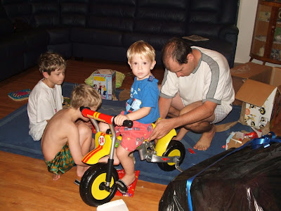 He got this bike from nanna and grandad that is lots of fun. We got him a Lightning McQueen foldout sleeping bag lounge and a special coin from Yai Yai and Grandy to go in his collection.